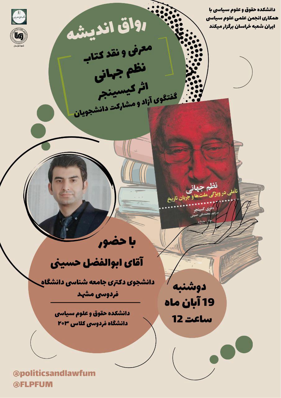 شعبه خراسان انجمن علوم سیاسی ایران با همکاری دانشکده حقوق و علوم سیاسی و انجمن علوم سیاسی دانشگاه فردوسی مشهد برگزار میکند: