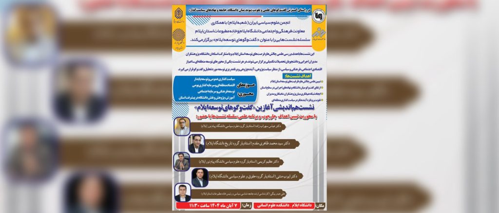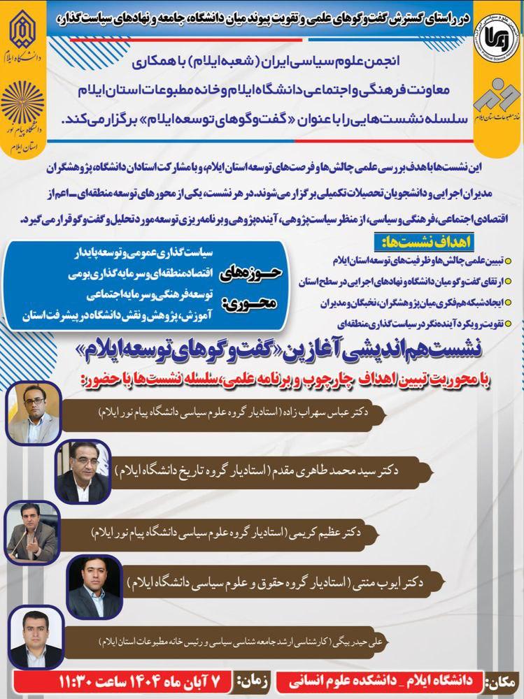شعبه ایلام انجمن علوم سیاسی ایران با همکاری معاونت فرهنگی و اجتماعی دانشگاه ایلام، دانشگاه پیام نور ایلام و خانه مطبوعات استان ایلام برگزار میکند: